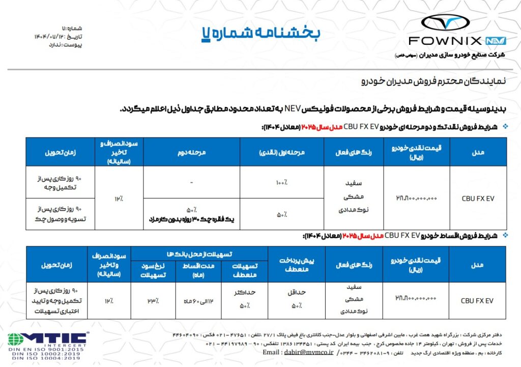 نمایندگی مدیران خودرو شفقتیان کد 293 از سال 1390 فعالیت خودش رو در شهر زنجان آغاز کرده است. این نمایندگی با تکیه بر تجربه و تخصص در فروش، خدمات پس از فروش و تأمین قطعات، یکی از معتبرترین مراکز عرضه خودروهای امویام، فونیکس(مدیران خودرو) در کشور میباشد.مجموعه ما انواع مدلهای شهری و کراساور را در سبد محصولات دارد، از خودروهای کوچک شهری گرفته تا شاسیبلندهای قدرتمند و هیبریدی. مشتریان میتوانند برای مدلهایی مانندX33 کراس (دستی و اتوماتیک)، X55 Pro، و همچنین مدلهای فونیکس مثل اف7، اف8، و مدلهای پلاگین هیبرید / برقی به مجموعه ما مراجعه کنند.